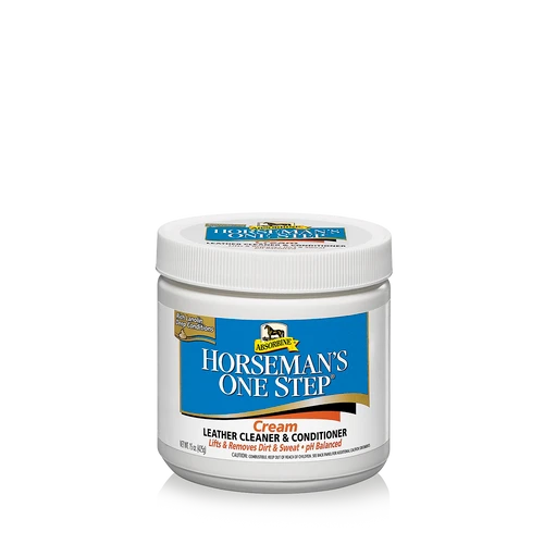 Horseman’s One Step Cream from Absorbine is a Leather Cleaner and Conditioner for tack that’s quick and convenient. Horseman’s One Step Cream contains cleaning agents to remove dirt, sweat, and salt while protecting leather from drying. One Step is great for saddles, bridles and tack, boots and shoes – you name it! Unique lanolin-based formula leaves no greasy residue. Horseman’s One Step reconditions old, tired leather while still allowing leather to breathe. Easy to use cream – simply use damp cloth to apply. Not recommended for use on suede.