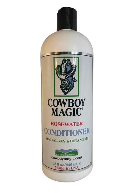 Rosewater Conditioner, by Cowboy Magic, cleans your horse’s mane, tail and coat while dissolving mineral and chemical build-up that can cause dullness. Similar to the neutralization and clarification treatments you can get for your own hair at a salon, Rosewater Conditioner leaves your horse’s hair squeaky clean and shiny. With silk and panthenol for deep conditioning, you need only apply a small amount of this concentrated conditioner after shampooing to get great results. May be diluted or used straight.
