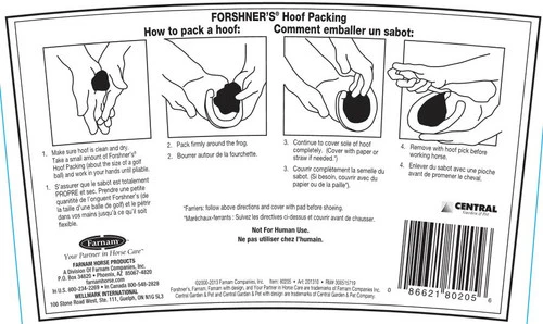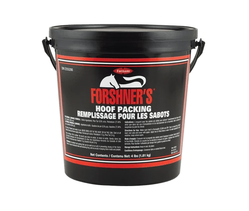 Forshner’s Hoof Packing by Farnam is the original hoof pack for horses that farriers appreciate because it’s easy and works great! For over 25 years horse owners and horseshoers have used Forshner’s Hoof Packing to restore health and moisture balance to horses’ hooves. The thick black hoof packing is a blend of pine tar and oils in a petrolatum base that helps prevent hoof dryness, contracted heels, and hardened frogs. Forshner’s emollient hoof pack is thick yet malleable and will form around frog and hoof grooves. When used by farriers it can be covered with a pad. Horse owners can cover with paper or even straw or shavings. The 4 lb bucket will last a very long time. Be sure to pick up a box of to use with the Forshner’s or your fingernails will end up packed like the hooves! Fantastic hoof care product that provides steady moisture and support to hard working hooves.