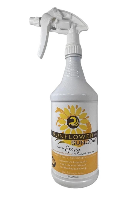 Sunflower Suncoat SPF Spray conditions your horse’s coat, mane & tail while providing safe and effective protection against the sun. Coat conditioning and sun protective spray from Healthy HairCare contains sunflower extract. Sunflower extract protects against sun damage from UV-A radiation that can damage your horse’s coat and skin. Sun blockers add protection from UV-B rays. Sunflower Suncoat SPF is a great grooming and conditioning spray for horses that need protection from sun damage.