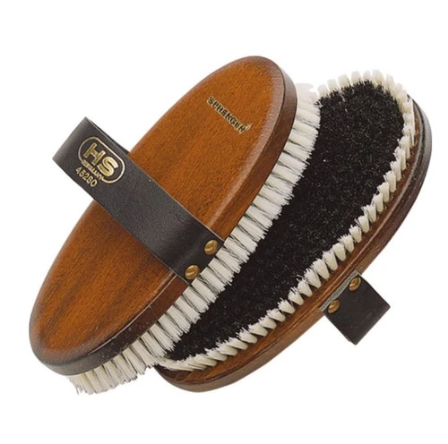 The Herm Sprenger Perlonborsten Brush is made with black perlon (Germany’s version of nylon) with a white surround. Bristles are embedded in a wooden, mahogany-effect back with a leather strap. Classic horse grooming brush from Sprenger is made in Germany. The Herm Sprenger Perlonborsten Brush measures 210 mm x 90 mm.