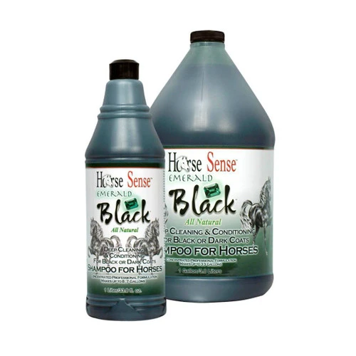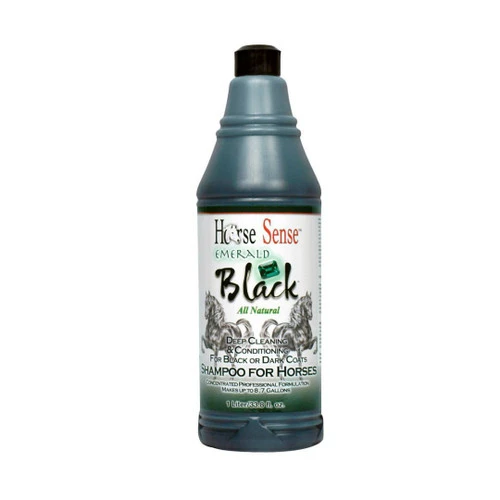 Horse Sense Emerald Black Shampoo will clean, condition and deepen dark tones in the coats of black or dark colored horses. Formulated to remove red tones, and brassy colors resulting from sun damage, Black Emerald shampoo is super concentrated so this one liter bottle makes 32 liters of rich, luxurious shampoo. Deep cleaning Emerald Black leaves your dark horse clean, gleaming and smelling great too!