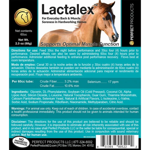 Lactalex Paste by Perfect Prep is formulated to enhance a horse’s comfort and muscle function by aiming to reduce the build-up of lactic acid often caused by strenuous physical activity. This reduction in lactic acid helps equine athletes maintain stamina and avoid fatigue. Lactalex is designed to prevent common performance related issues such as back soreness and tying up. Perfect Prep Lactalex Paste comes in an easy to administer 60cc oral syringe. Will not yield a positive drug test at competitive events.