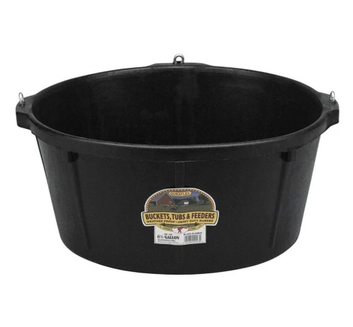 Little Giant Rubber Feed Pan with 3 rings for hanging comes from Miller Manufacturing. It is made of DuraFlex heavy duty, flexible black rubber. This feed tub has a 6.5 gallon capacity. Ideal for outdoor use since it’s weatherproof.