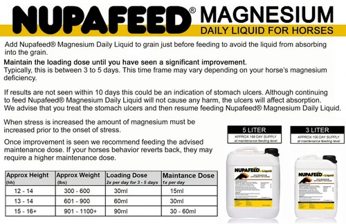 Nupafeed Magnesium Daily Liquid helps horses achieve the correct balance of calcium and magnesium for muscles to work properly. A stressed horse will burn off magnesium, leading to a calcium overload that results in nervousness, tight muscles, and erratic behavior. Nupafeed is an effective solution for magnesium deficiency. Simply top dress on your horses feed by using the included pump.
