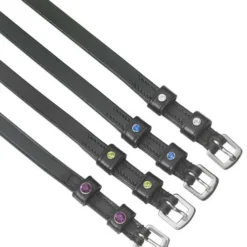 Swarovski Crystal Stud Spur Straps for ladies are tastefully elegant with a tiny bit of sparkle. Why not have a little fun with an everyday necesssity? Pretty Swarovski crystals in a simple stud setting come in several beautiful colors. Black leather spur straps with decoration on the double keepers. 18 inches long. Crystal colors: Purple, Green, Blue, Clear.
