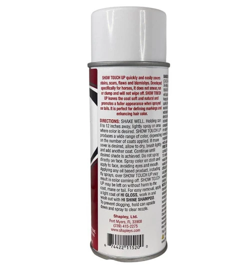 Created exclusively by Shapley’s, Show Touch-Up Color Enhancing Sprays are to safely and effectively conceal stains, scars, blemishes, and flaws. Show Touch-Ups cover completely and will produce a wide range of color depending on the number of coats applied. The colors will not smear, clump, rub off or damage the coat. Show Touch-Ups can also be used to enhance tails and feathered legs, creating a full, natural look. Show Touch Up spray can be easily removed with oil based product.