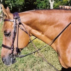 The rich dark leather shows off the elaborately engraved bright cut silver on each piece. The nose and cheek overlays, oversize spade buckles, tips, and accents feature a detailed feather scrolled pattern that catches the light. Tory’s Western show halter is fully adjustable at the crown and under the chin for length as well as width. The Rochester Congress Show Halter comes complete with a leather lead with stainless steel stud chain. Beautiful silver halter for your special horse!