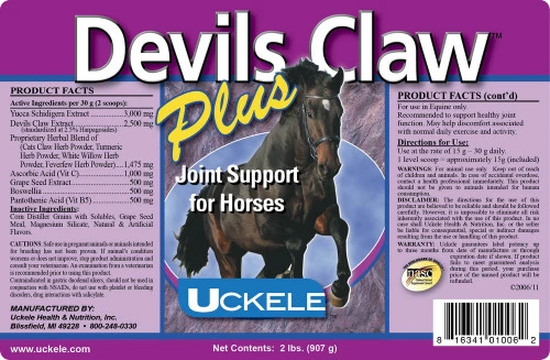 Formulated with Devils Claw, Yucca and other proprietary herbs & botanicals, Devils Claw Plus Joint Supplement for horses from Uckele provides natural, nutritional support to keep your horse’s muscles, tendons, ligaments & joints at their best. If you are looking for equine joint support that doesn’t contain synthetics, Devil’s Claw Plus is a carefully formulated natural alternative. Uckele products are manufactured to the highest purity standards – a name you can trust. Fed at the rate of 15 – 30 g per day, this jar contains a 30 to 60 day supply for one horse.